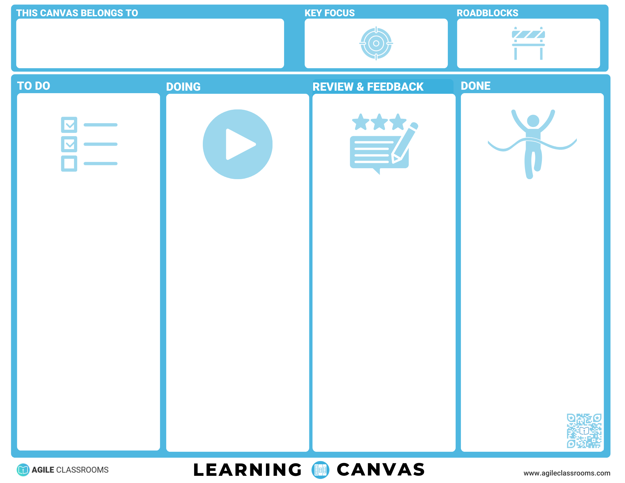 The Agile Learning Canvas shifts the learning process from teacher-centered to student-driven. Students learn how to: