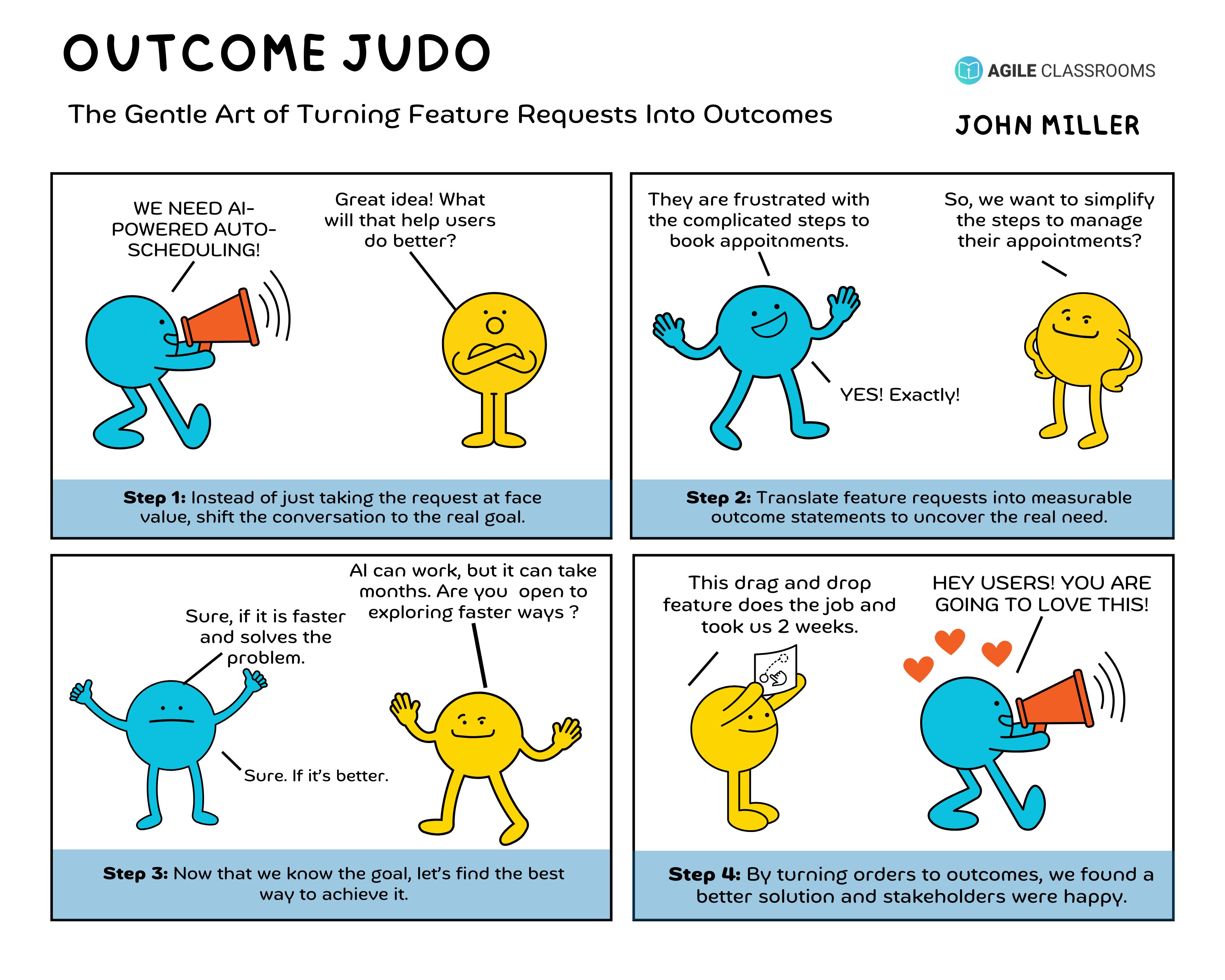 Outcome Judo trains stakeholders to bring problems and needs, not just solutions.