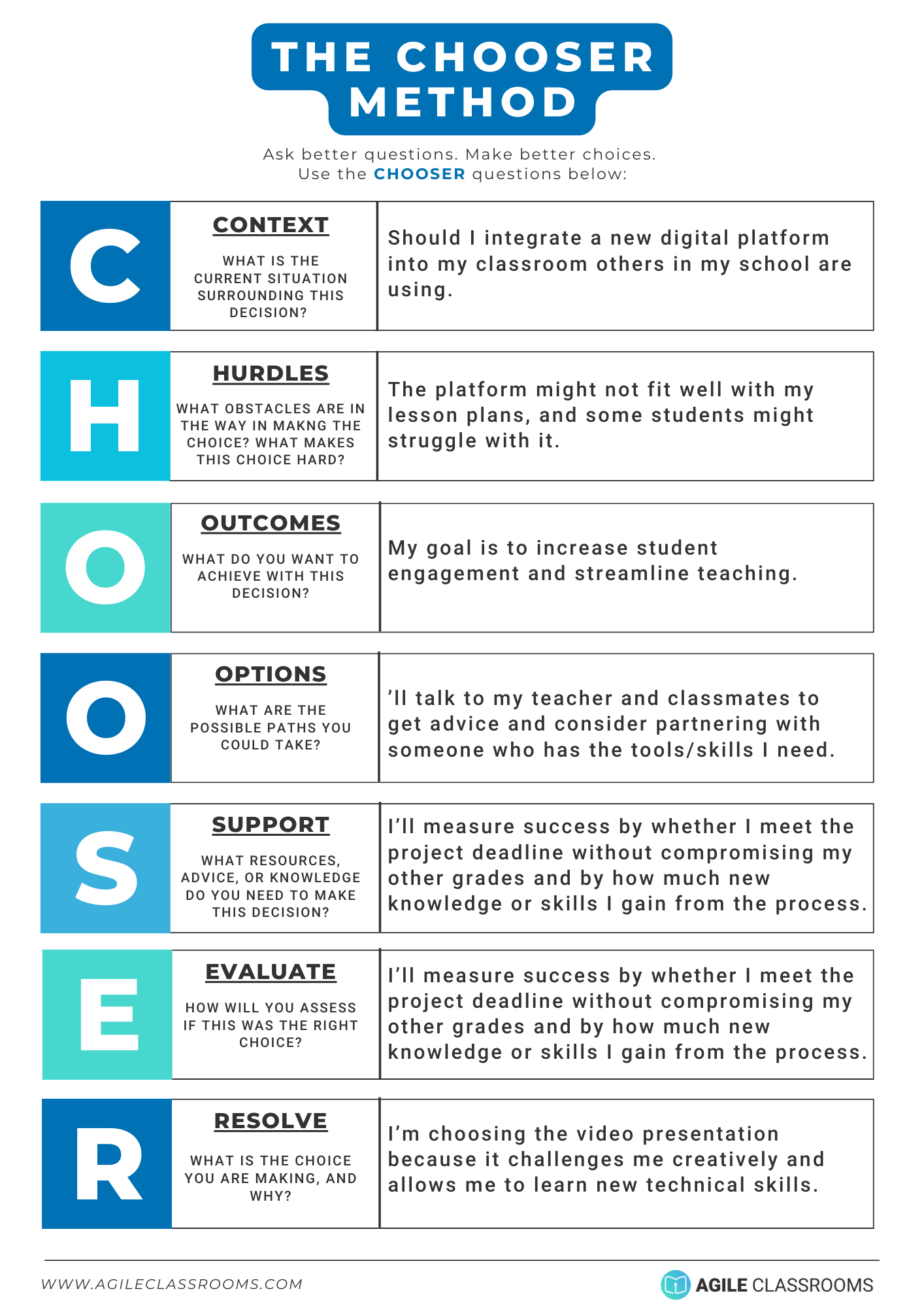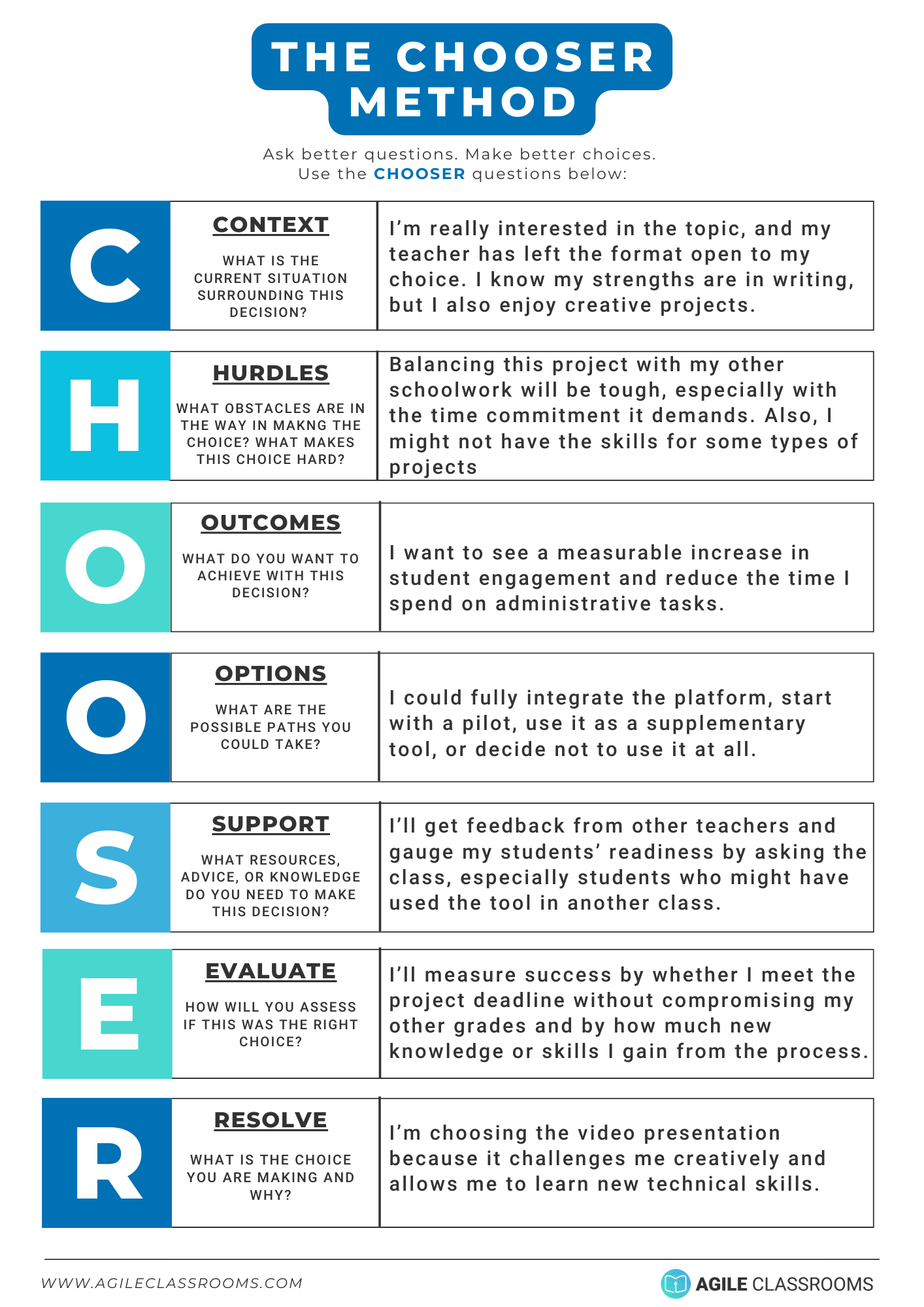 By systematically answering these questions, you illuminate your path, revealing both the forest and the trees. CHOOSER serves as a beacon for anyone lost in the fog of decision-making, applicable to choices both monumental and mundane.