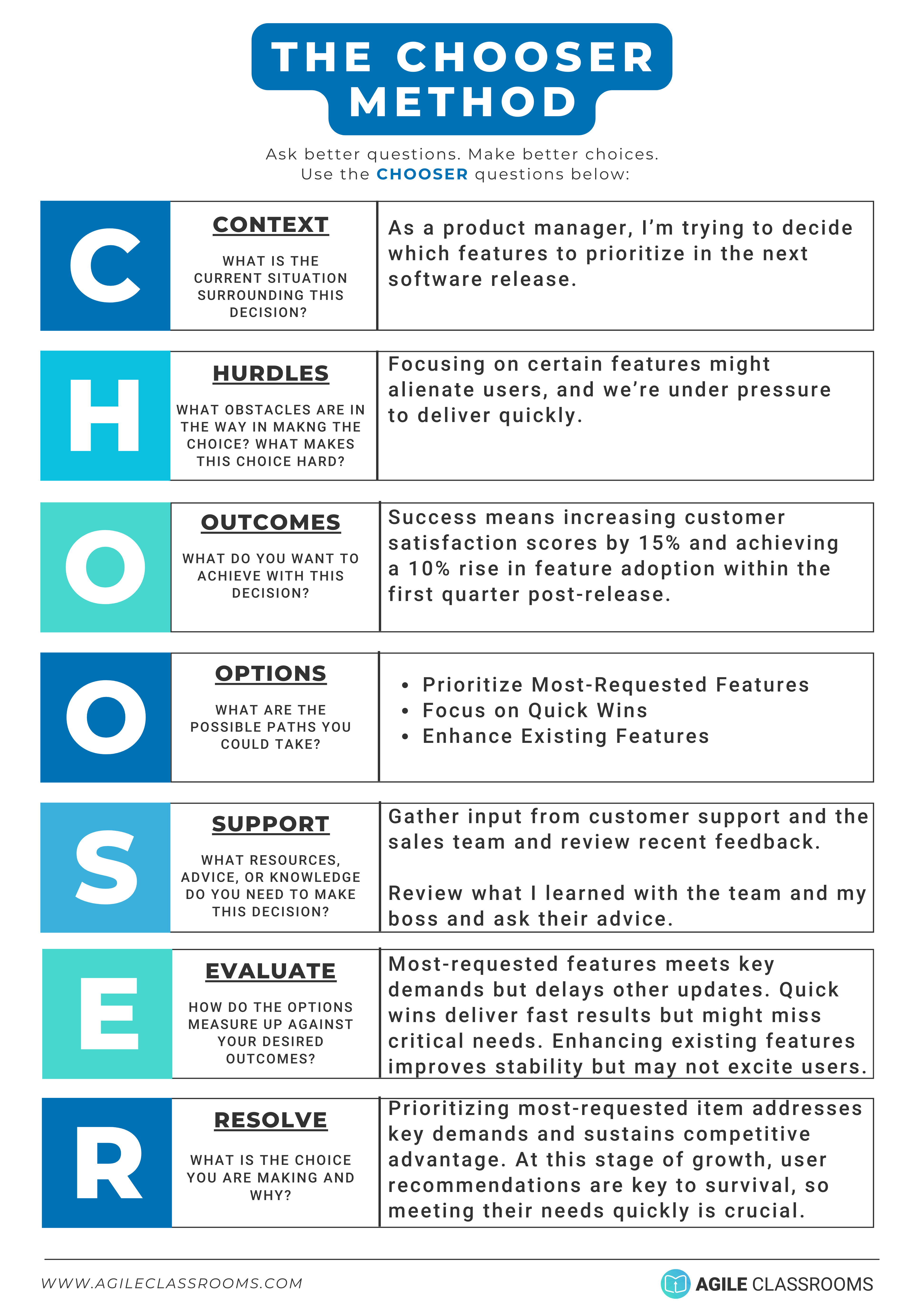A product manager faces the challenge of selecting features for the next release. CHOOSER brings clarity to this complex product decision.