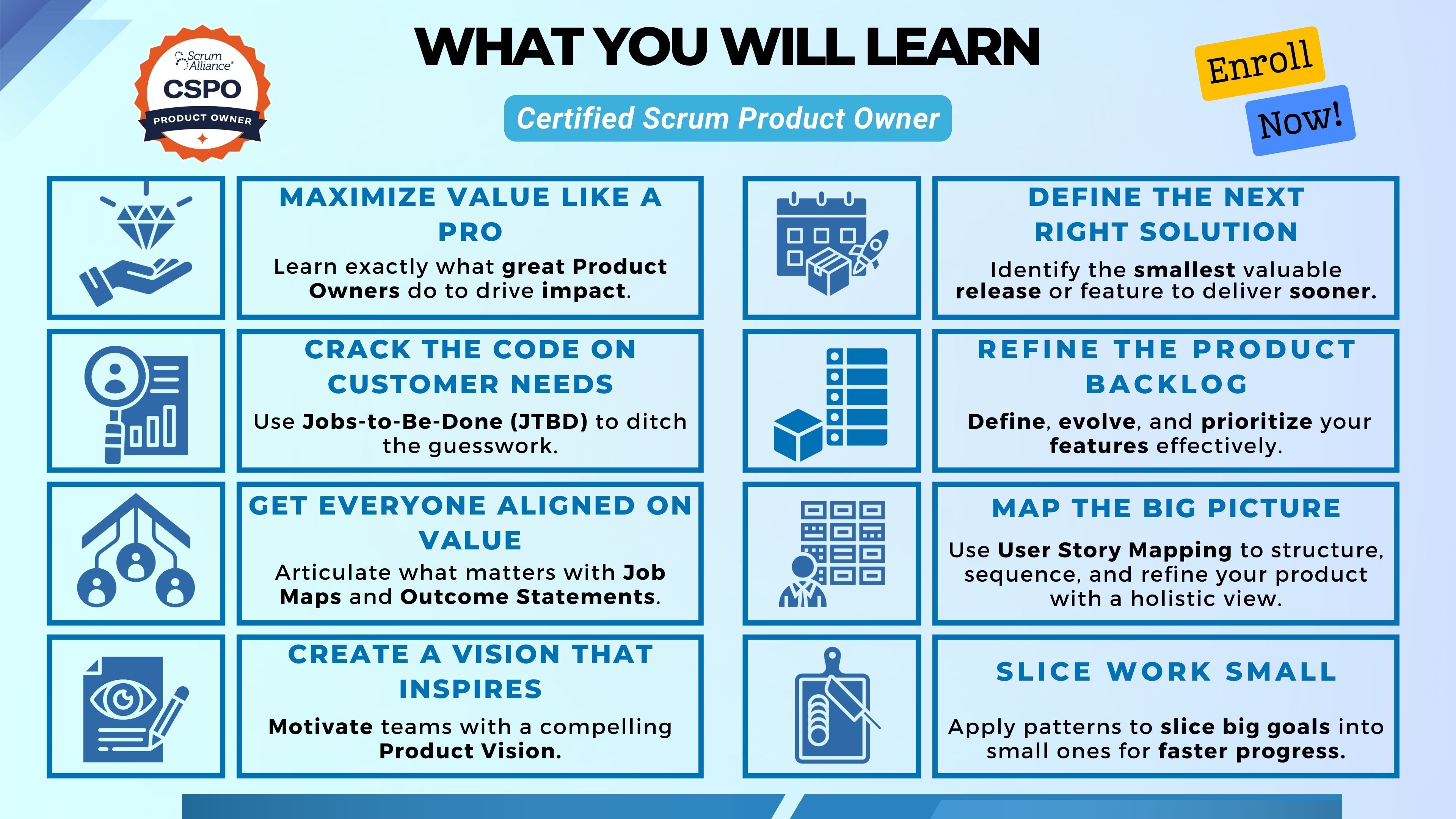 Most CSPO courses spend 50% of the time rehashing Scrum Master basics. Not this one. We go all in on real Product Owner work—strategy, prioritization, and customer insights. Whether you're a PO, PM, or balancing both, you'll leave with tools you can use immediately.