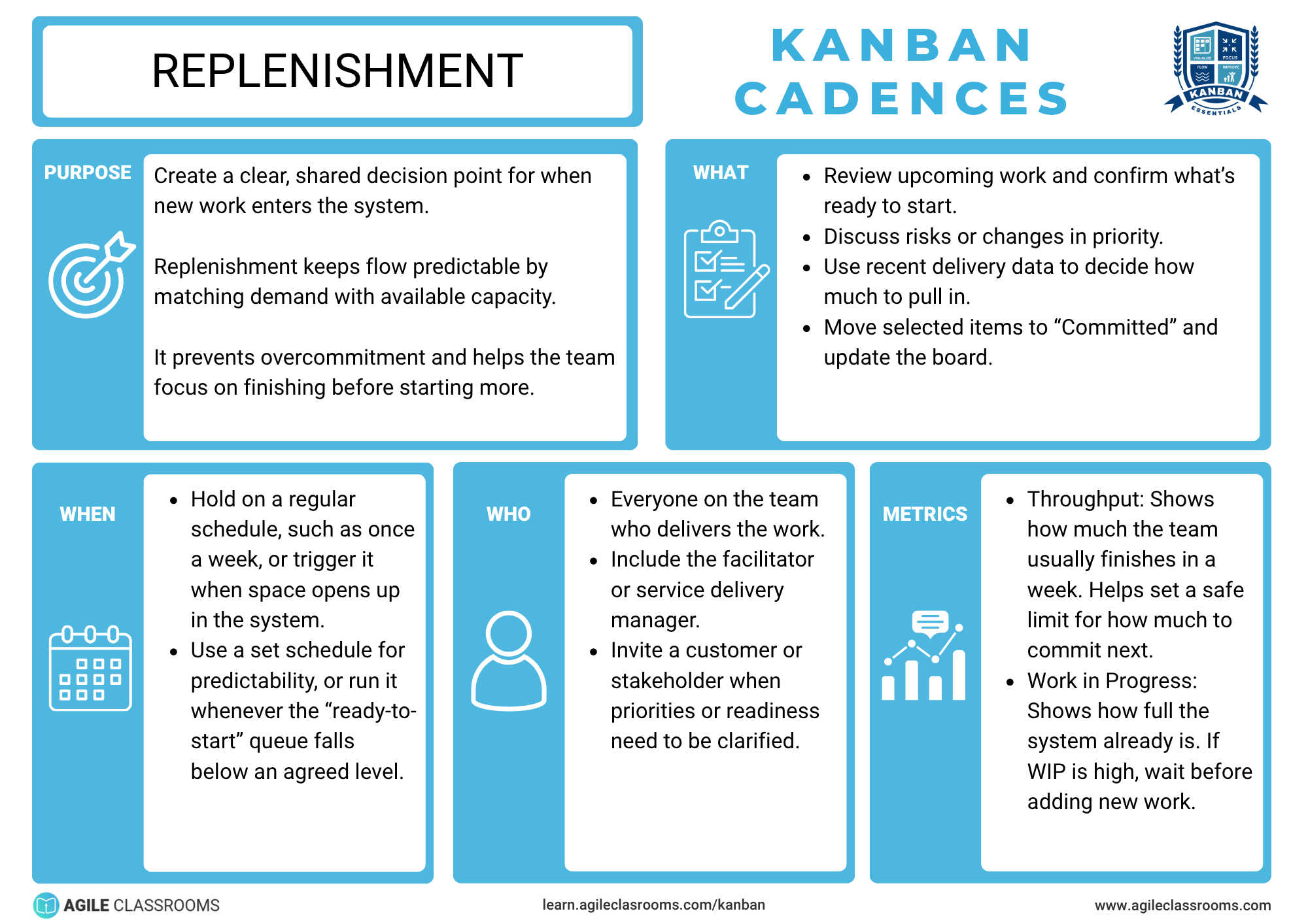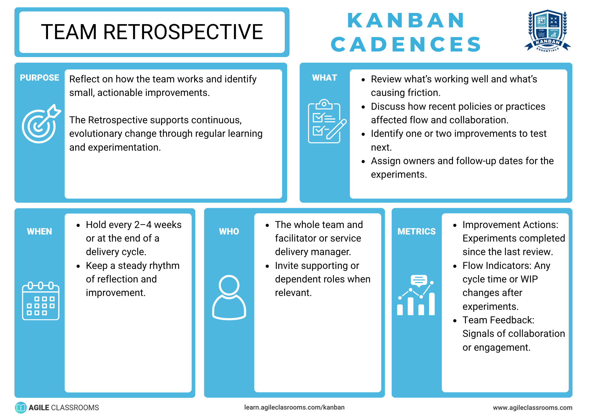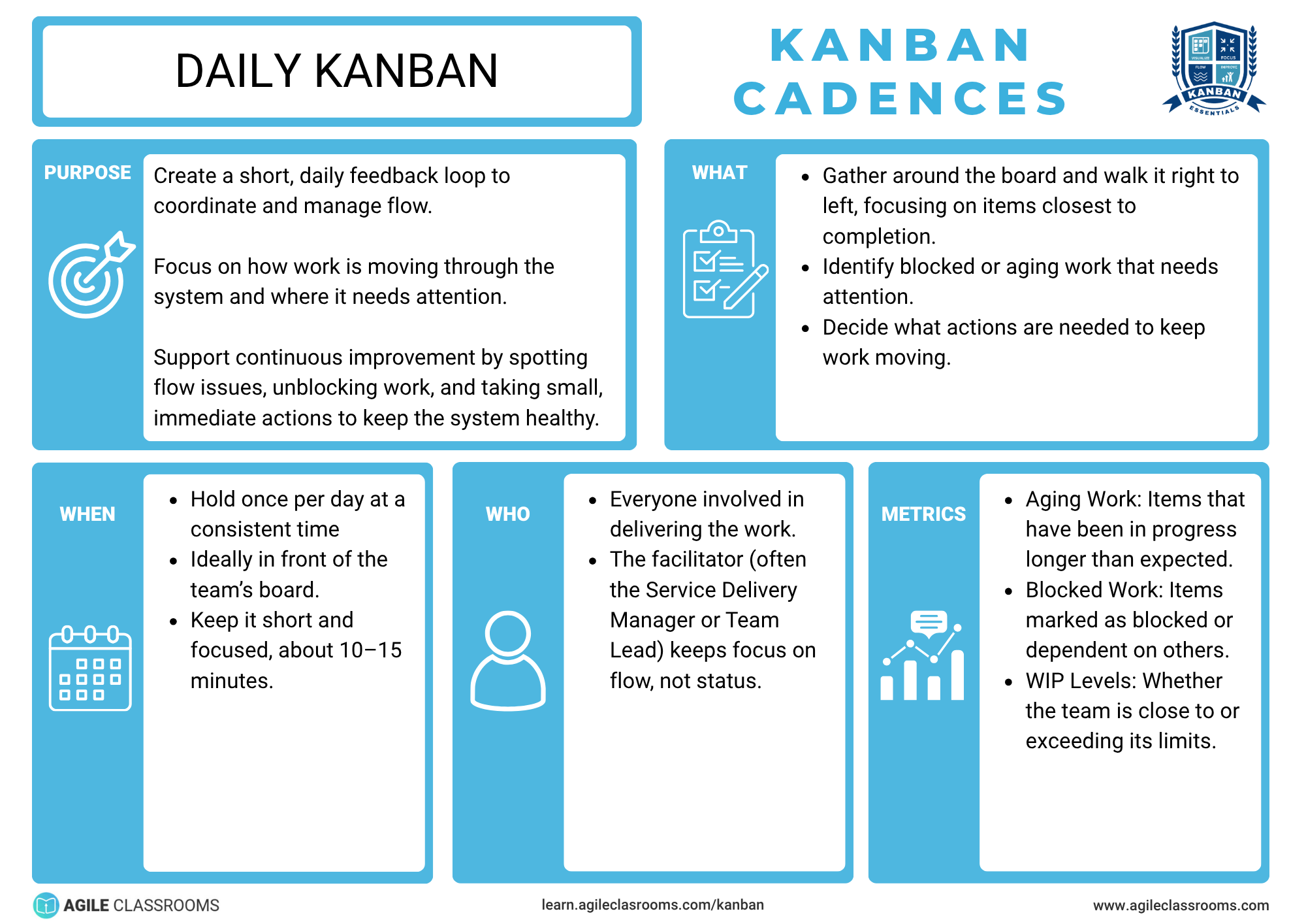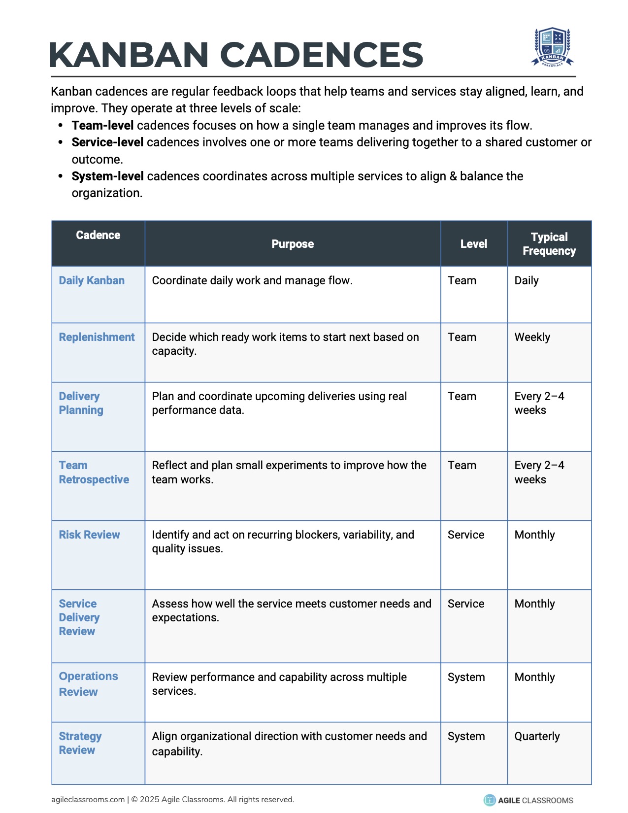 Kanban solves this by using cadences: regular feedback loops designed to keep the system healthy.