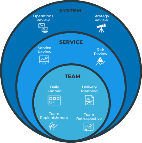 Service-level cadences involve one or more teams delivering together to a shared customer or outcome.